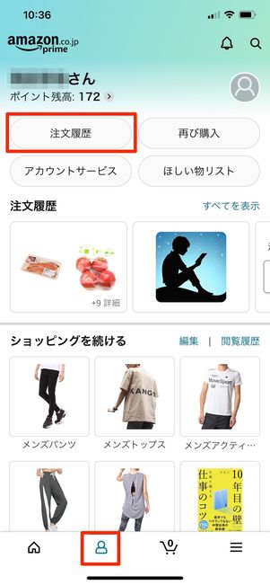 アプリ画面下の人型アイコンから[注文履歴]をタップし、Amazonライフで注文した履歴を選択します。