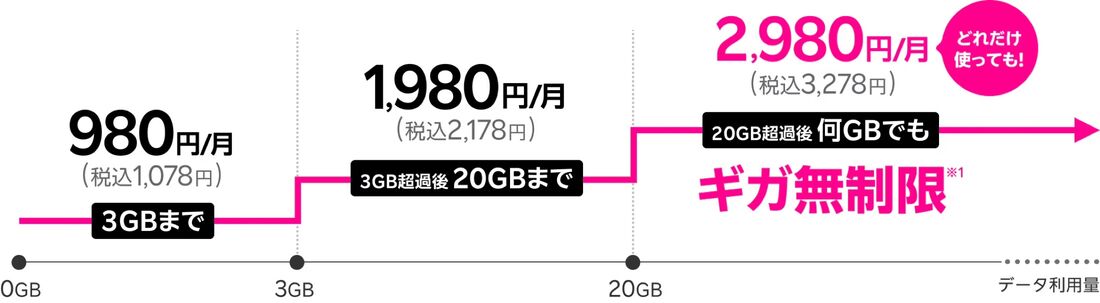 費用こそかかってしまいますが、3GB+国内通話かけ放題(楽天リンク)も含むと考えればコスパは悪くないはず。データ使用量が20GBを超えると月額3278円でデータ通信が無制限なので、サブ回線としてだけでなくメイン回線にも向いています。