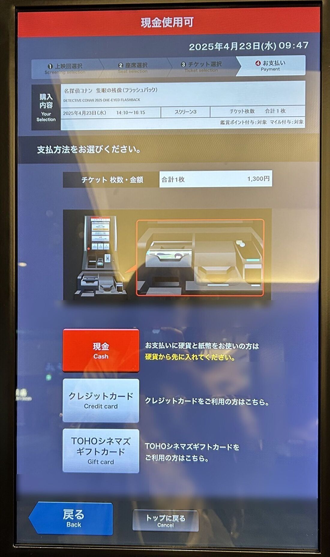 ただ、前述した通りTOHOシネマズの自動発券機は現金に対応していないタイプも存在します。現金で購入したい場合は、画面上に「現金使用可」と記載された発券機を選んでください(詳しくは後述)。