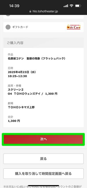 支払いをおこないます。現金対応の自動発券機なら「現金」「クレジットカード」「TOHOシネマズギフトカード」の3種類が利用可能です。