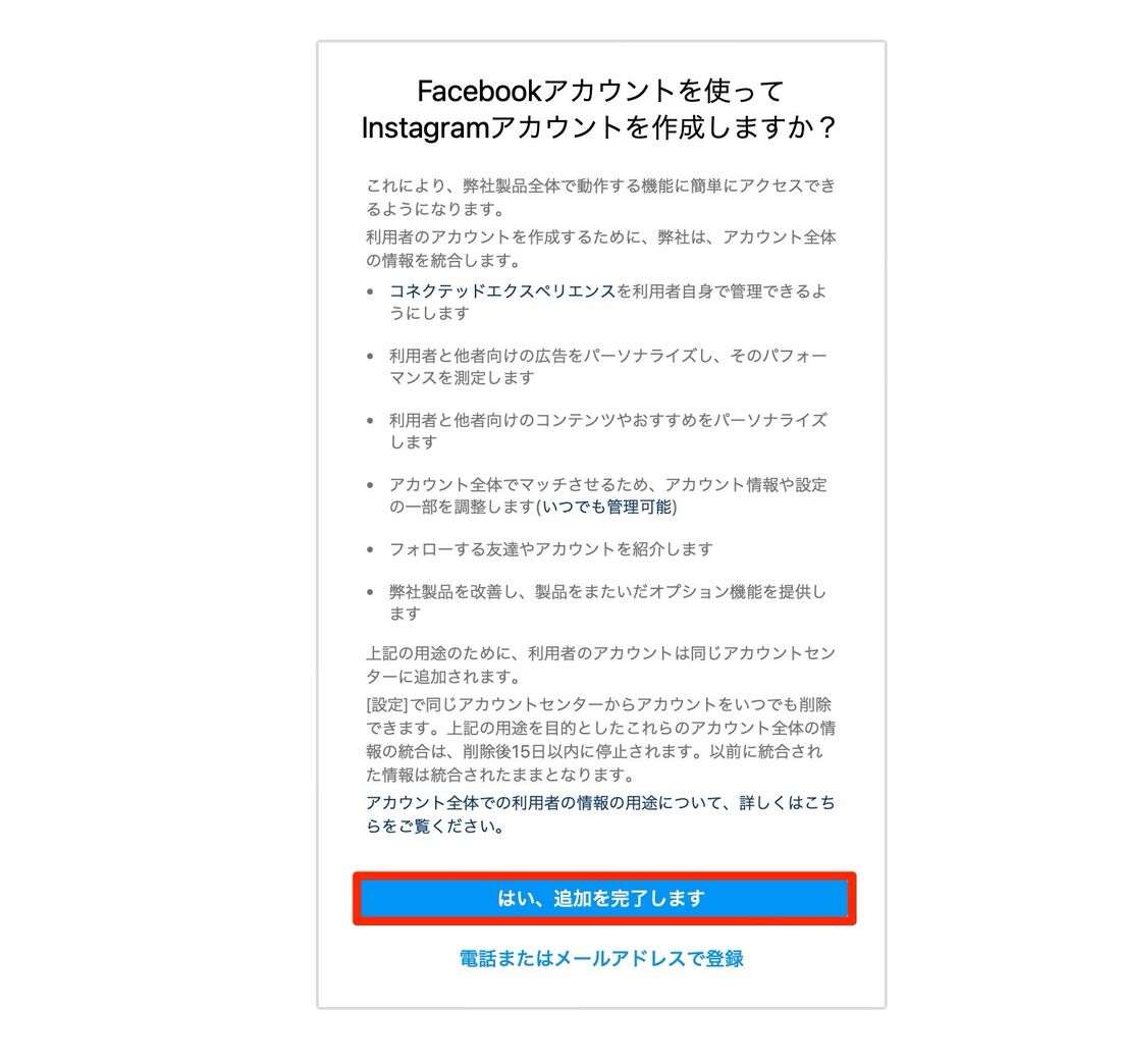 Facebookアカウントを使って登録する場合も、インスタグラムアプリから操作が可能です。