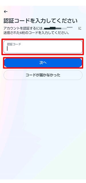 - 本人確認のための二段階認証をおこなう(SMSまたはメール宛に届いた6桁の数字の認証コードをアプリに入力)