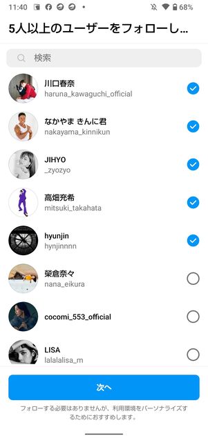 任意で他のアカウントをフォローすることができます。ここで表示されるアカウントは、芸能人など公式マークが付いたアカウントがほとんどです。誰もフォローせずに[次へ]に進んでも構いません。