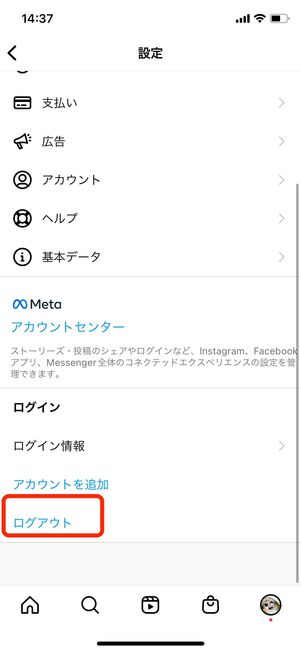 プロフィール画面右上にあるメニューボタンから[設定とプライバシー]を開き、画面一番下にある[ログアウト]をタップします。