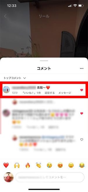 同様に、吹き出しアイコン部分をタップすると、リールに付いているコメントが確認できます。