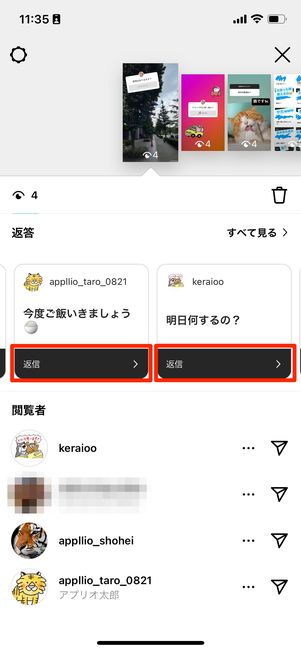 これで、他のストーリー閲覧者に返答ユーザーの個人情報をバラすことなく、一括回答ができます。