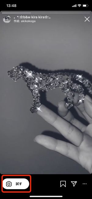 エフェクト画面で[試す]を選択すると、自分のストーリー作成画面に切り替わります。ここから、当該エフェクトを使って撮影を楽しめます。
