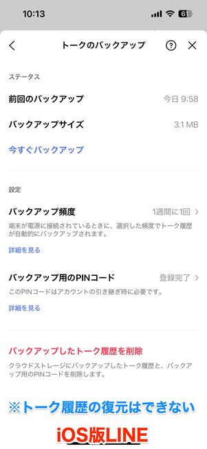 トークを削除してしまった後に最新のバックアップをとってしまうと、目的のトークは復元できません。また、PINコードを設定していたとしても、そもそもiOS版LINEの設定内には復元機能が備わっていないため、このケースにおいてPINコードは意味を成しません。