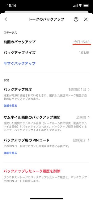 「前回のバックアップ」の日時がPINコードを設定した時刻と同じであることを確認してください。