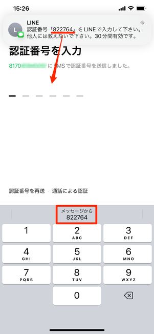 端末の電話番号を入力すると、SMS宛に認証番号が届くので入力してください。