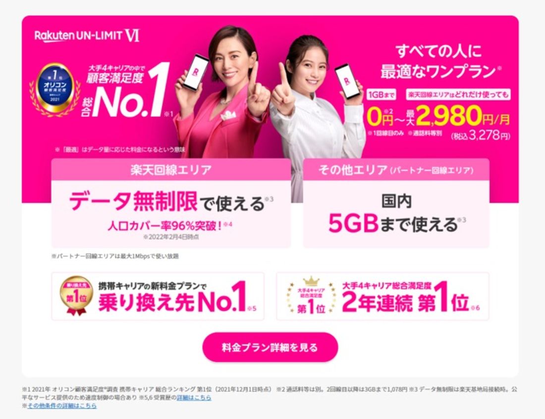 - 専用アプリ「Rakuten Link(楽天リンク)」を使えば他社携帯番号・固定番号も含めた通話が無料(一部番号除く)。SMSも無料