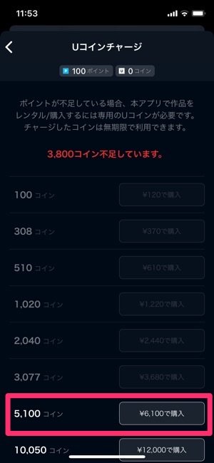 iPhoneのU-NEXTアプリから購入する場合、iOS版アプリ専用コイン「U-コイン」で決済します。保有ポイントが不足している際、必要な額のU-コインをチャージして購入します。